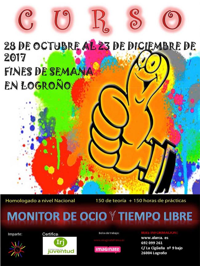 28 de octubre hasta el 23 de diciembre de 2017 en Logroño. Apúntate al curso de Monitor de Ocio y Tiempo Libre que imparte Escuela Alarca.