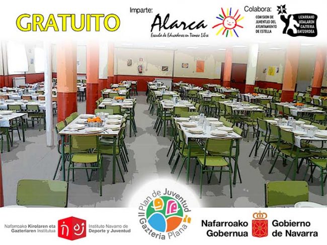 Formación para la manipulación de alimentos, válida para el área de campamentos y restauración-hostelería. Curso GRATUITO de auxiliar de comedor en Estella. Imparte Escuela Alarca y colabora la comisión de Juventud del Ayuntamiento de Estella.