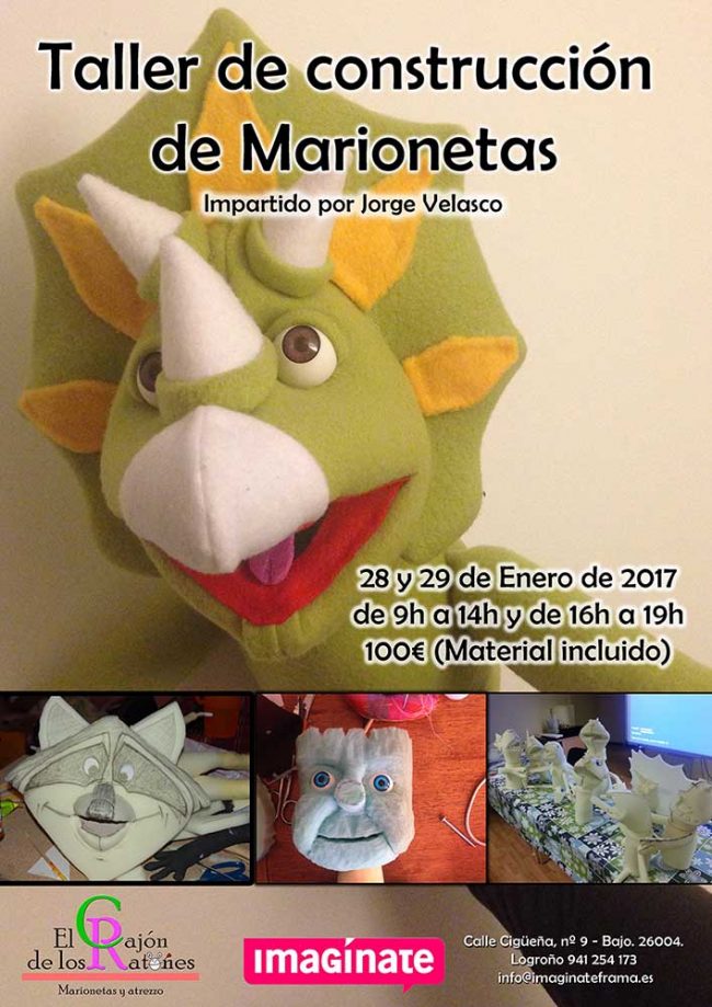 Imagínate impartirá los días 28 y 29 de enero de 2017 un taller de construcción de marionetas. Será impartido por Jorge Velasco, El Cajón de los Ratones.