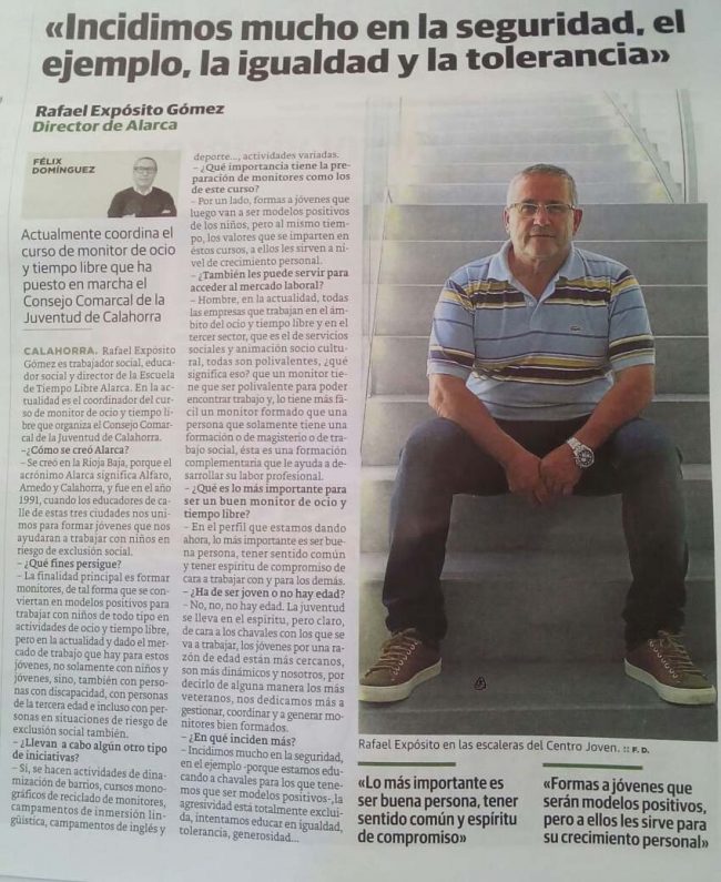 Ayer 18 de Julio publicaron en el periódico La Rioja una noticia de Rafael Expósito Gómez, director de la Escuela Alarca. Rafael Expósito forma a más de 100 monitores cada año, incidiendo en los valores de igualdad, tolerancia y ayuda a los demás.