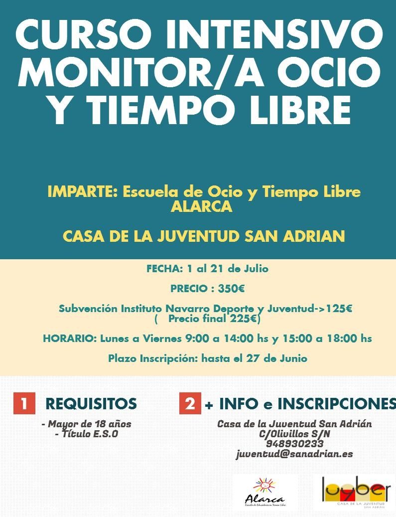 Escuela de Ocio y Tiempo Libre Alarca realiza de 1 al 25 de Julio el Curso Intensivo de Monitor/a de Ocio y Tiempo Libre, en la Casa de la Juventud de San Adrián.