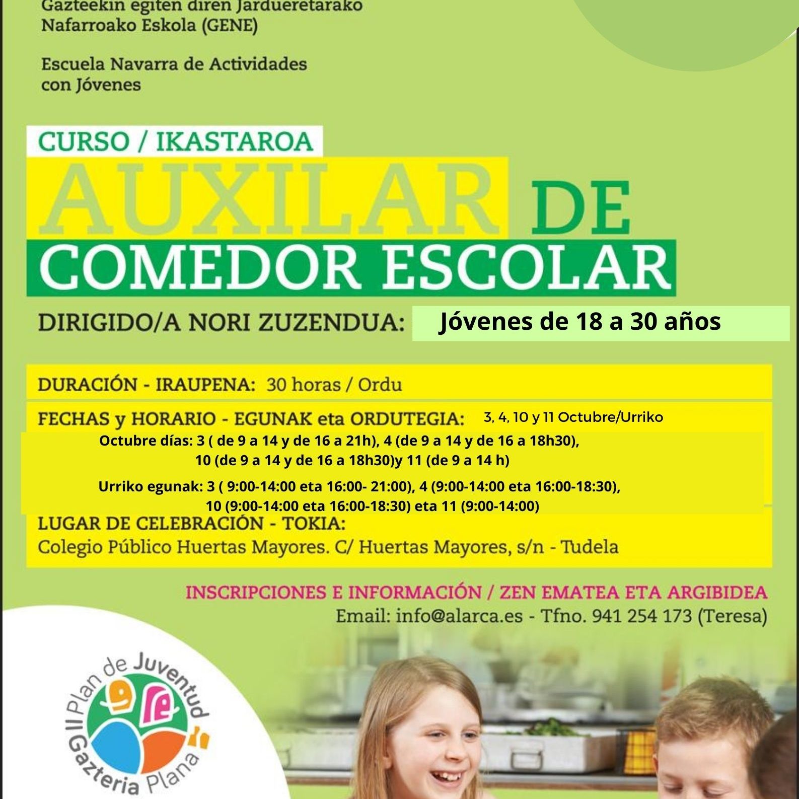 DetallesCurso GRATUITO de Auxiliar de Comedor Escolar en Tudela, dirigido a jóvenes de 18 a 30 años.
