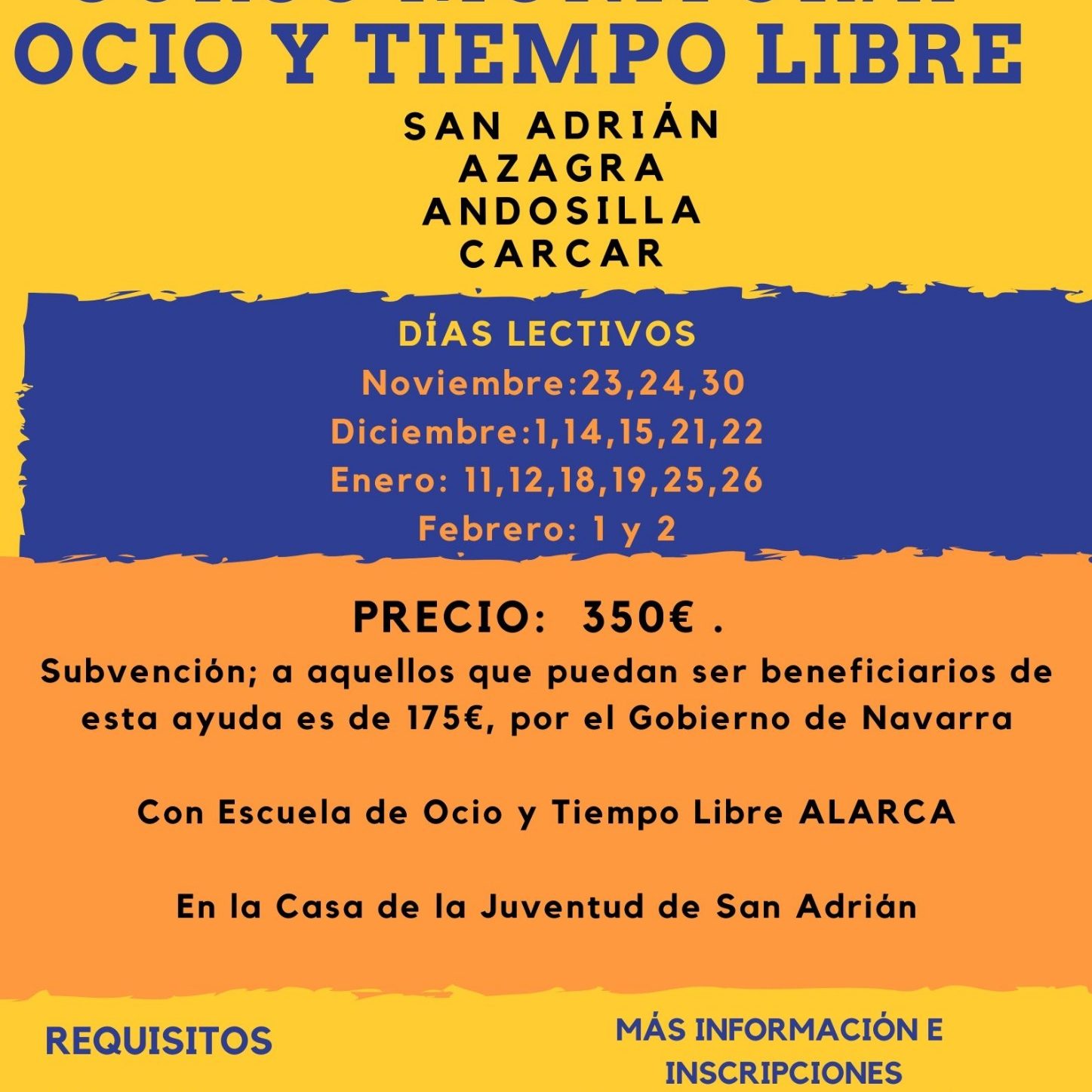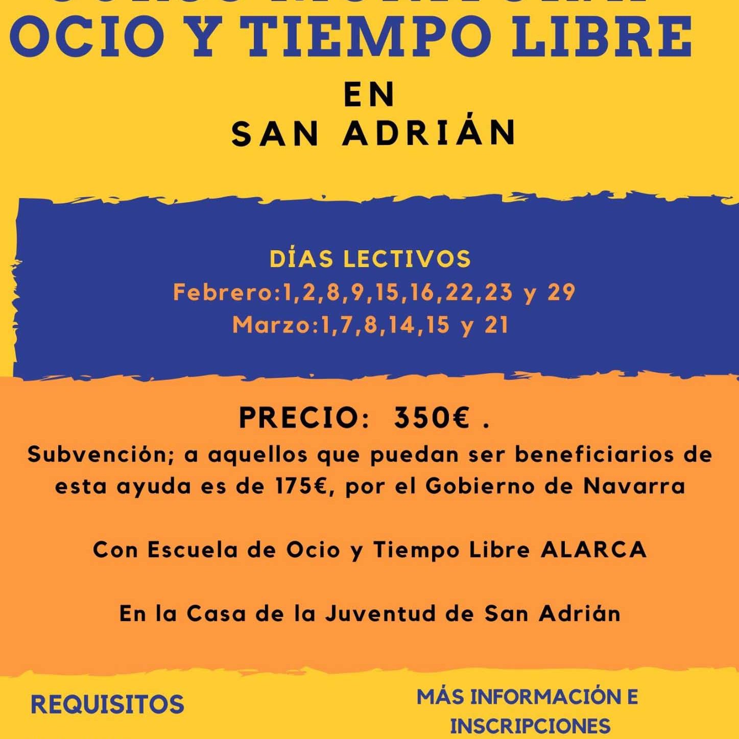 DetallesCurso de monitor en San Adrián Curso de monitor/a Ocio y Tiempo Libre en San Adrián durante los meses de Febrero y Marzo. DÍAS LECTIVOS FEBRERO: 1, 2, 8, 9, 15, 16, 22, 23 y 29. MARZO:1, 7, 8, 14, 15 y 21. PRECIO: 350€. Subvención a aquéllos que puedan ser beneficiarios de esta ayuda…