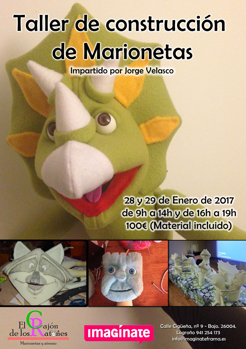 Taller de Construcción de Marionetas impartido por Jorge Velasco los días 28 y 29 de enero de 2017. El taller tendrá lugar en Imagínate Frama en calle Cigüeña 9 Bajo. El precio es de 100€ con el material incluido.